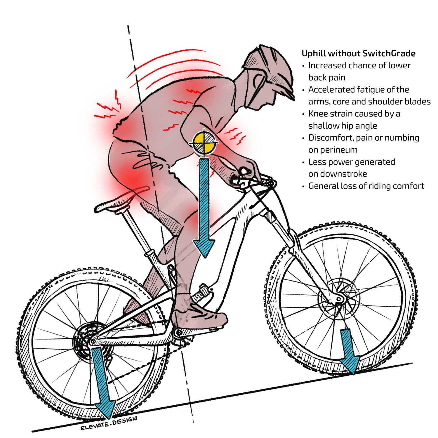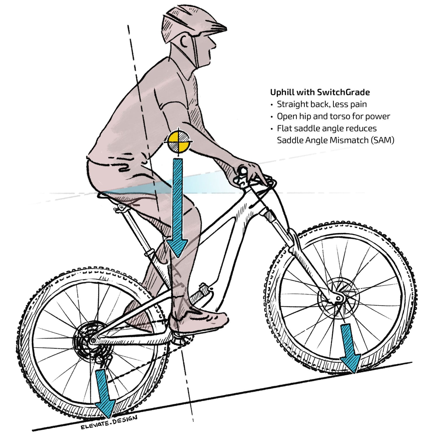 登りやすく - サドルのノーズを下に傾けると、脚への圧力が軽減され、上り坂でのペダルをスムーズに漕ぐことができます。